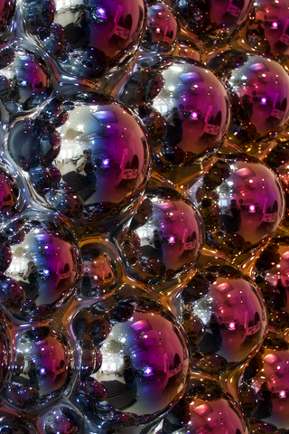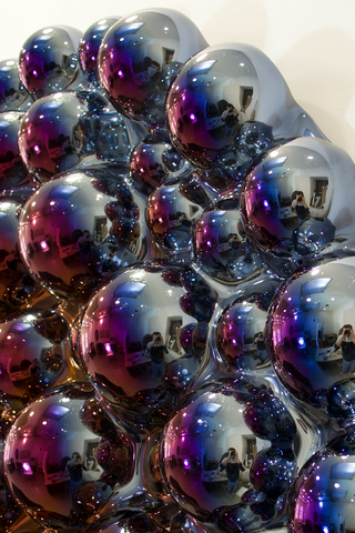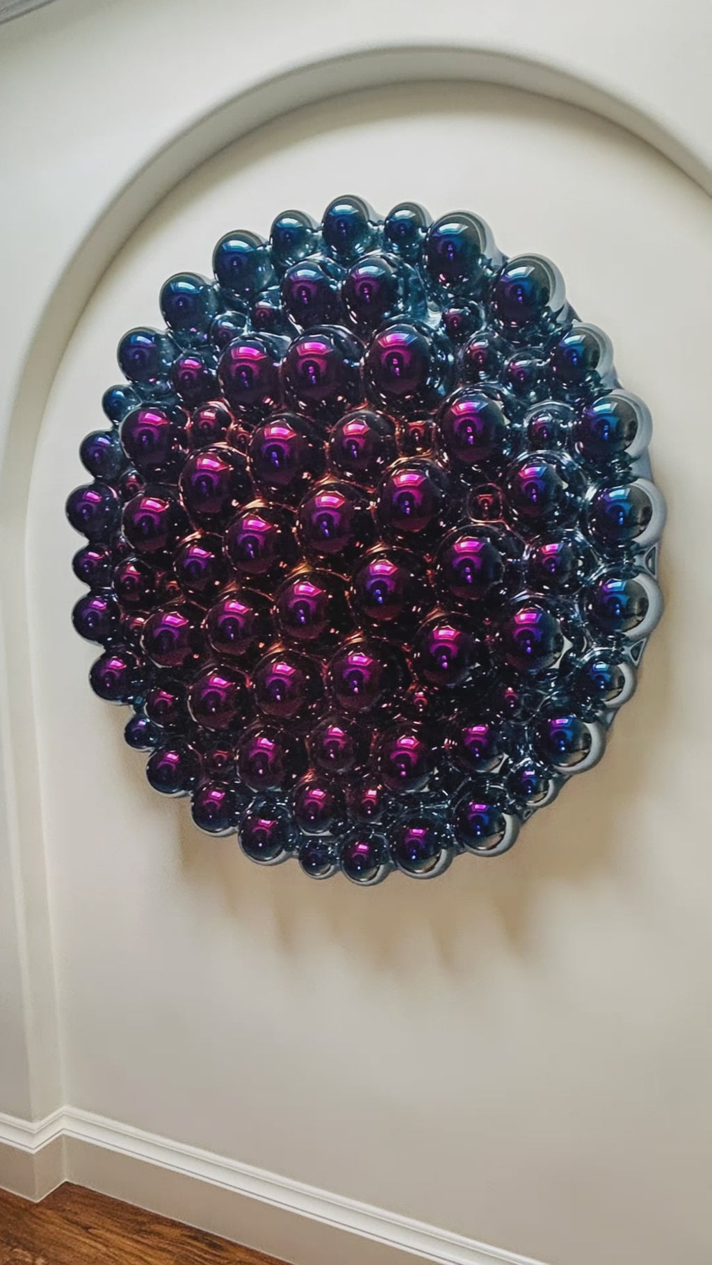 La scultura da parete Bubbles Purple trasforma un semplice specchio convesso in un piccolo campo di colore e distorsione. Lo strato di titanio si posiziona sul bordo blu-violetto dello spettro, così la luce del giorno crea riflessi lilla freddi, mentre le lampade della sera intensificano la tonalità verso il prugna. Le numerose cupole creano molteplici punti di vista: stando a sinistra si possono ammirare le nicchie del soffitto, a destra si possono vedere le lampade da terra allungarsi fino a formare delle lacrime. La cottura a mano crea minuscole increspature che interrompono i riflessi, conferendo a ogni pezzo le sue sottigliezze. Una volta utilizzata, questa scultura in vetro artistica si comporta meno come un oggetto decorativo e più come un partner che si adatta ai cambiamenti di luce: silenziosa all'alba, vivace a mezzogiorno, contemplativa dopo il tramonto.