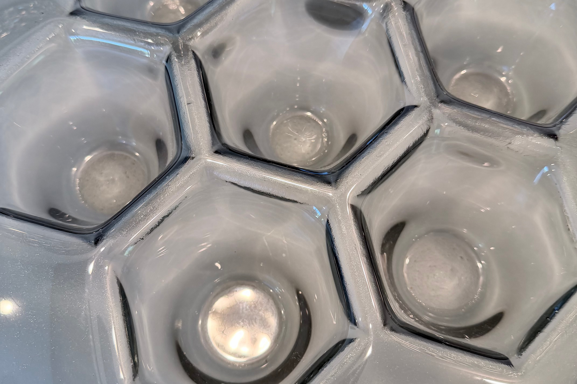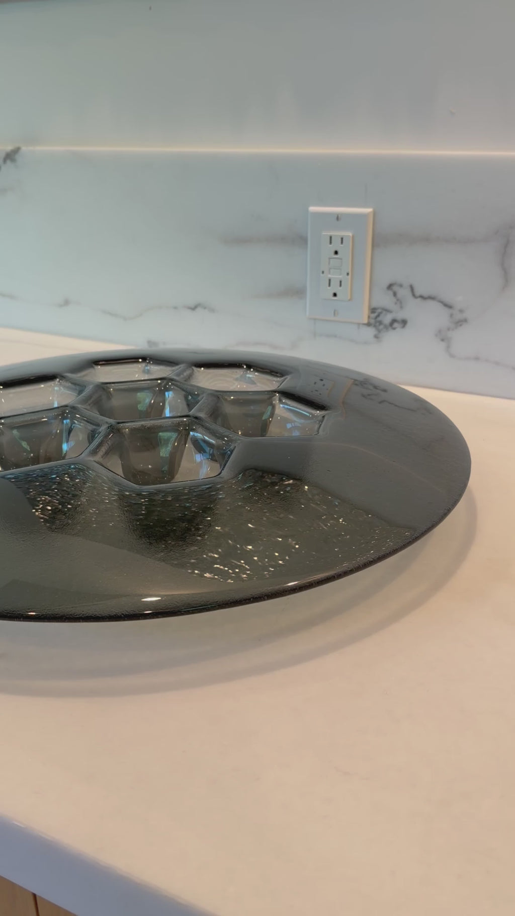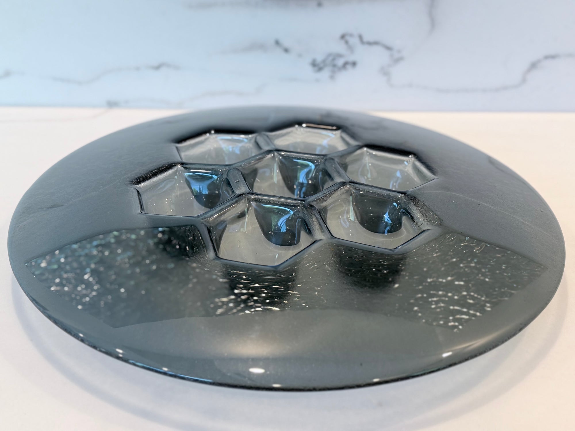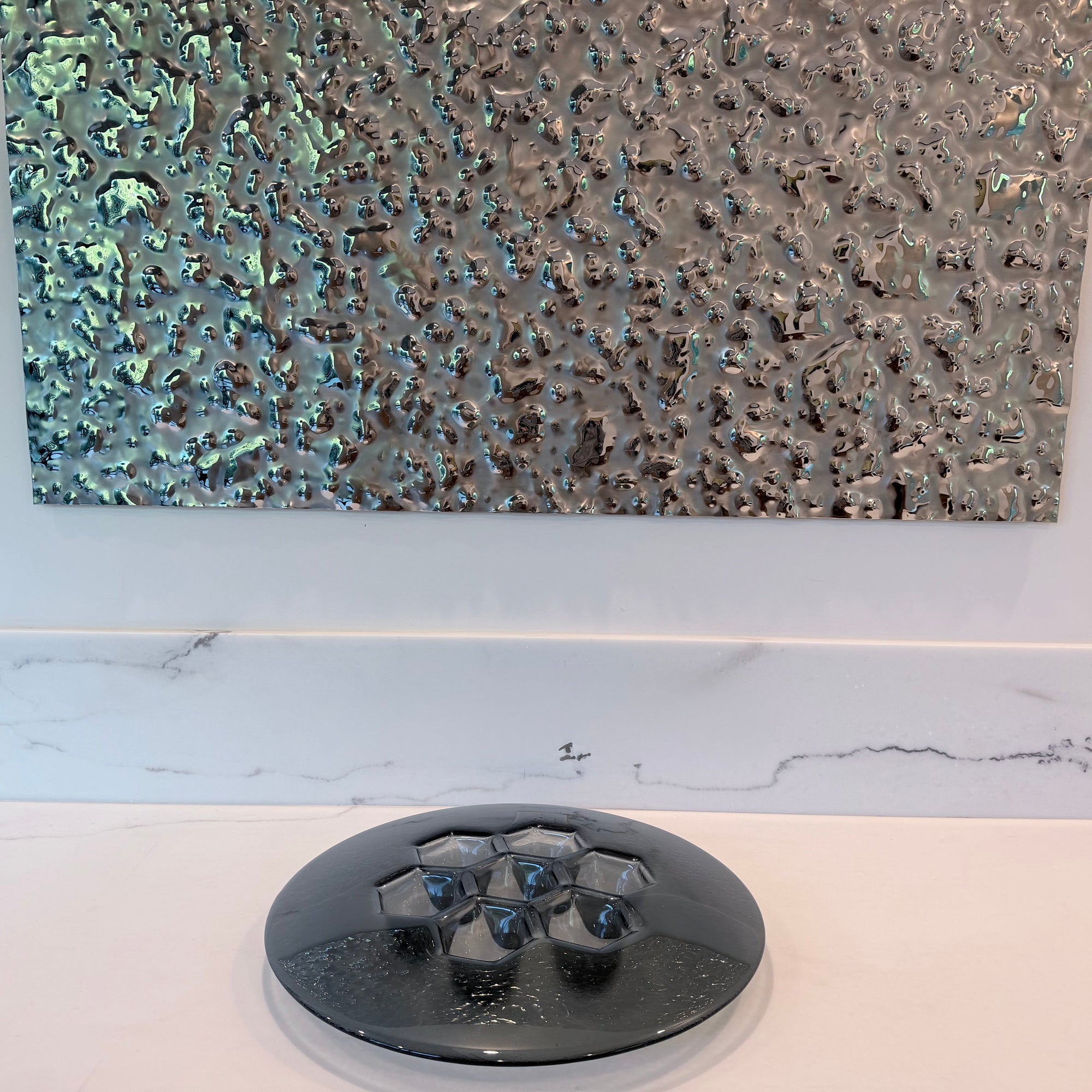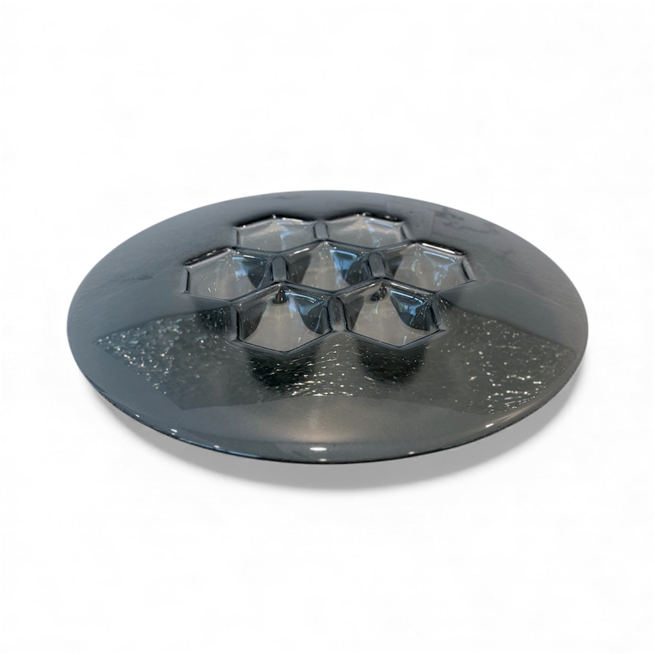 L'etichetta decorativa del piatto si adatta perfettamente al piatto Cells Grafit: PlusObject pressa l'identica geometria cellulare in un pezzo di vetro da 490 mm, quindi deposita a vapore titanio grigio ematite che vira dal carbone al blu acciaio con il movimento degli ospiti. Con un peso di 4 kg e un'altezza di 70 mm, il piatto è stabile sui banconi della reception ma si sposta facilmente durante lo styling. La metallizzazione antigraffio fissa il colore per decenni, mentre la superficie sfaccettata moltiplica la luce delle candele in sfumature cinematografiche.