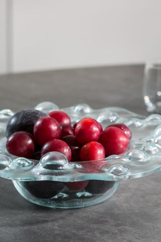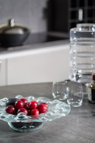 Geyser Diamond Water Bowl porta la trasparenza liquida in tavola: un disco di vetro cristallino da 41 cm che si abbassa di 11 cm al centro e sfoggia una trapunta di "gocce d'acqua" arrotondate. I maestri vetrai cuociono la lastra a 850 °C, lasciano che la gravità scolpisca i crateri e lucidano ogni cresta fino a farla brillare come ghiaccio sciolto. La trasparenza color diamante esalta i colori all'interno – prugne rubino, spicchi di lime o orchidee galleggianti – così che il contenuto diventi parte dell'opera d'arte. Un basamento sabbiato e un peso di 4 kg bloccano la ciotola su pietra o legno senza oscillazioni.