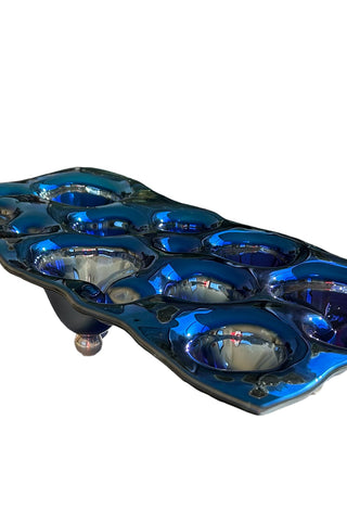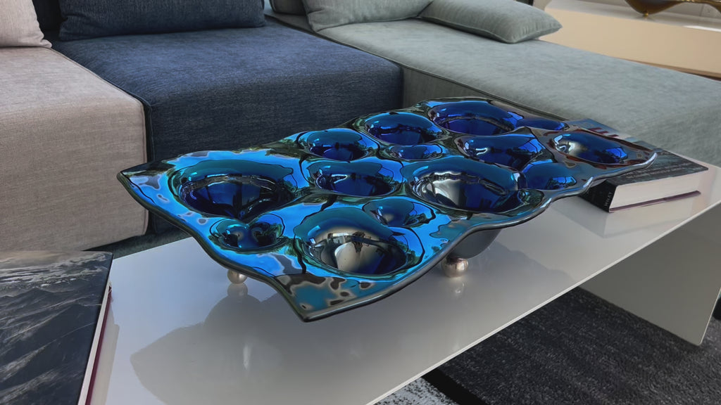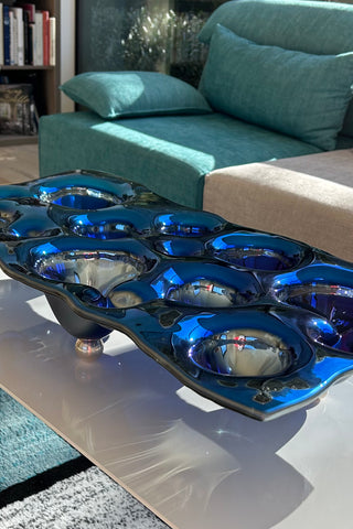 Liquid Metal Indigo è un enigma affascinante, che sfida ogni categorizzazione grazie al suo design unico e misterioso. Fonde perfettamente lo stile contemporaneo con una sobria eleganza. Questo versatile capolavoro può essere utilizzato come splendido piatto per frutta, verdura o noci, oppure impreziosire il vostro spazio come un affascinante elemento decorativo. Esplorate i territori inesplorati dell'estetica con Liquid Metal.
