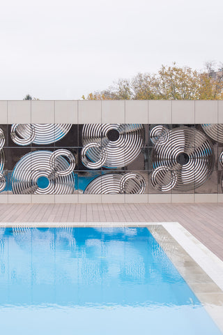 Questo progetto mette in mostra l'interferenza di onde di piccola ampiezza, lasciando che la luce del sole danzi da una cresta all'altra, trasformando il pannello in un accattivante gioco di luce e vetro. La tonalità bluastra illuminata dall'acqua della piscina aggiunge freschezza all'esterno. Utilizzare questo pannello modulare in qualsiasi momento della giornata è un vero piacere. Al mattino, imita un sole splendente; alla sera, riflette un crepuscolo accogliente e di notte, scintilla davvero, riflettendo la luce delle stelle e della luna.
