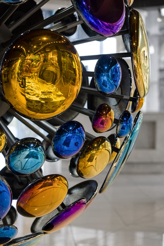 Una scultura risplende con l'elegante raffinatezza dell'argento, rispecchiando il cosmo nella sua forma più pura. L'altra affascina con un caleidoscopio di colori, che rappresenta l'infinita diversità dell'universo. Insieme, compongono una sinfonia celeste, invitando a fermarsi e riflettere sulle infinite distese che si estendono oltre il nostro mondo.
