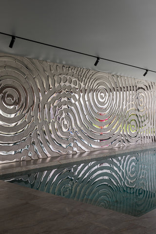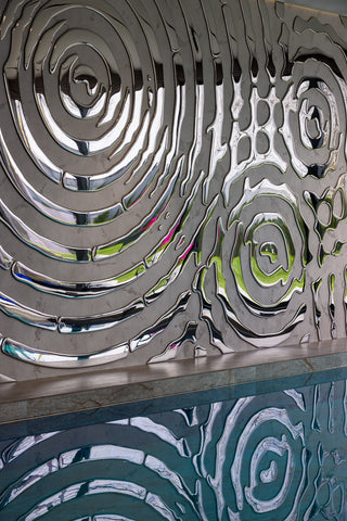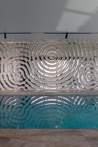 Crafted with precision and sophistication, our glass wall decor features titanium-coated glass elements that create a subtle water-like vibration, evoking the sensation of ripples and circles about to come to life. Whether for your home, office, or any other space, our Alternative Interference glass wall decor can be customized to match your vision. Elevate your surroundings with this captivating masterpiece, and let the magic of water frozen in glass transform your space.