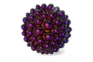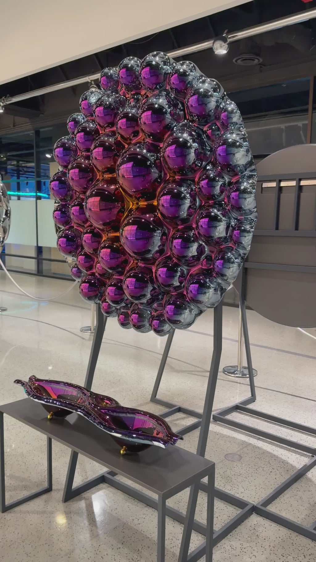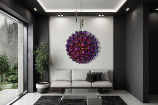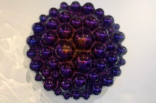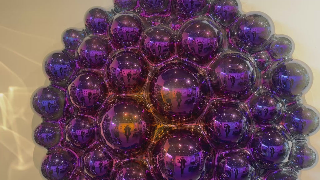 Bubbles Purple Wall Sculpture turns a simple convex mirror into a small field of colour and distortion. The titanium layer lands on the blue-violet edge of the spectrum, so daylight pulls cool lilac highlights while evening lamps deepen the hue toward plum. Multiple domes mean multiple viewpoints: stand left and you catch ceiling coves, stand right and see floor lamps stretch into teardrops. Hand firing leaves minute ripples that break up glare, giving each piece its own subtleties. In use, this artistic statement glass sculpture acts less like a decorative object and more like a partner to changing light — quiet at dawn, lively at noon, contemplative after dusk.
