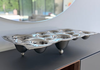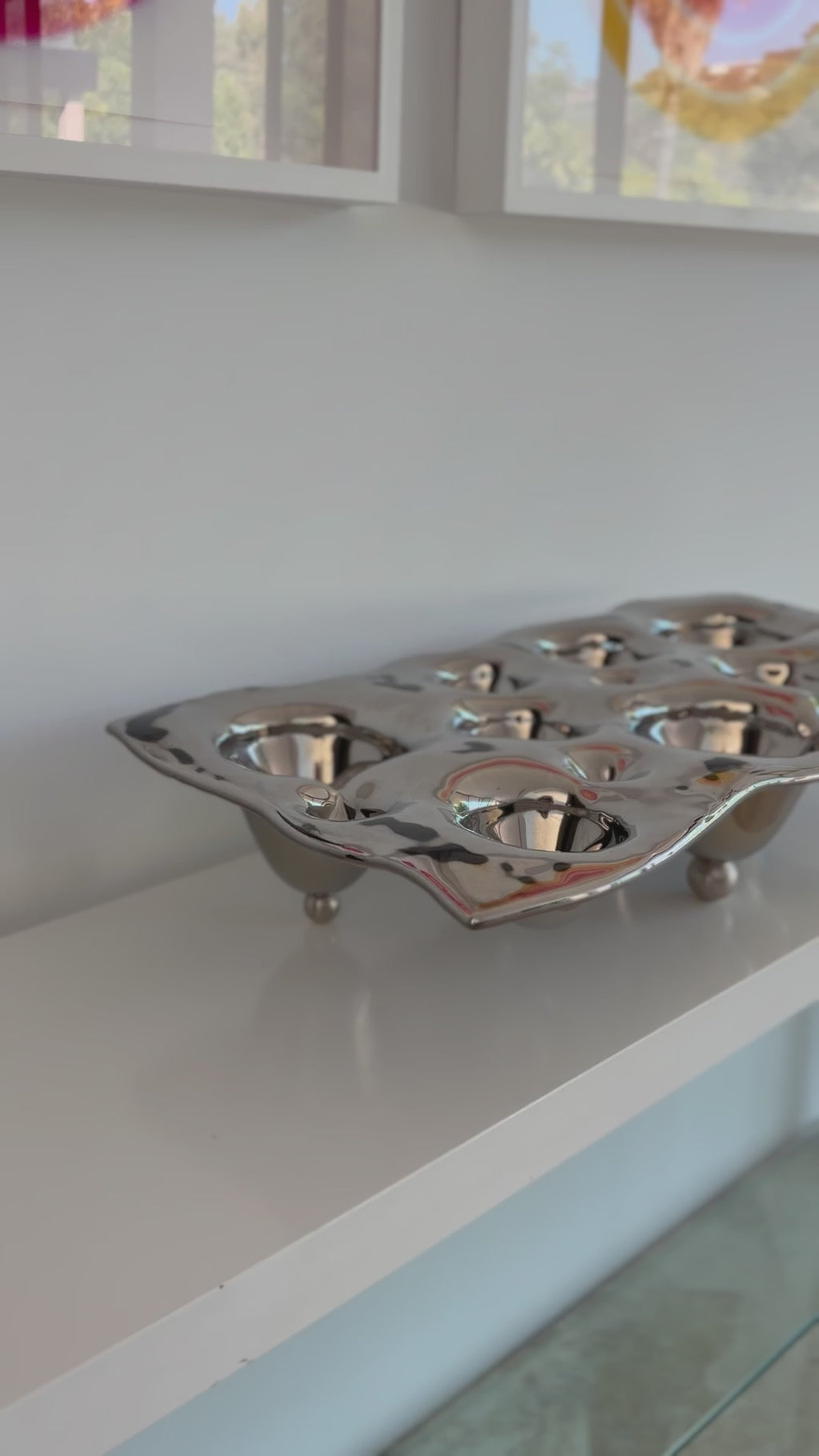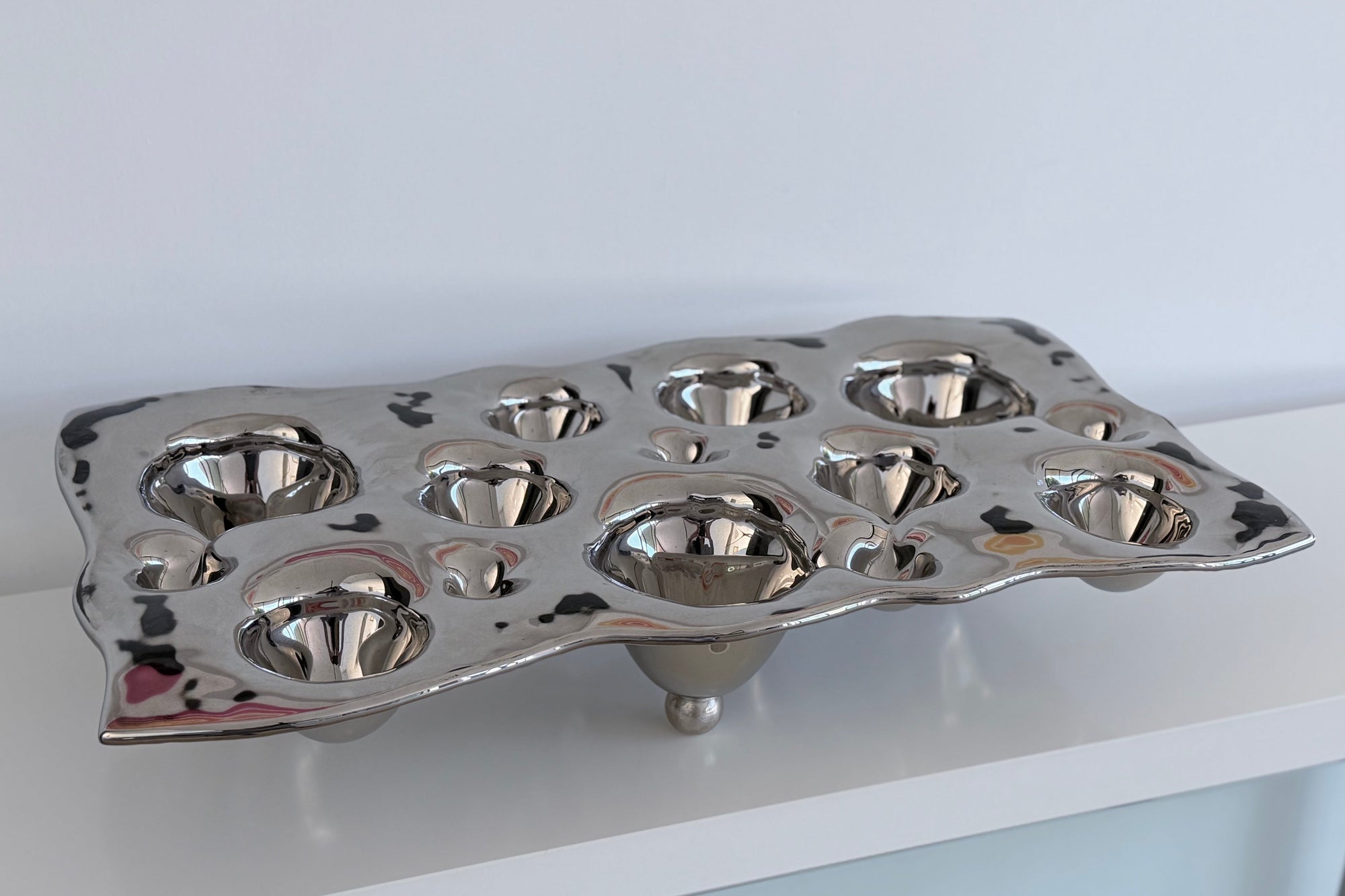 Liquid Metal Silver Platter finishes the flowing silhouette with mirror-grade brilliance but keeps the exact 680 × 370 mm stage and 7 kg authority. No glare-diffusing tint softens the impact; instead, pure specular flash matches chrome fixtures and smoked glassware. Use this heavy expensive bowl to carry chilled champagne flutes, or leave it empty so architecture can reflect inside its folded planes.