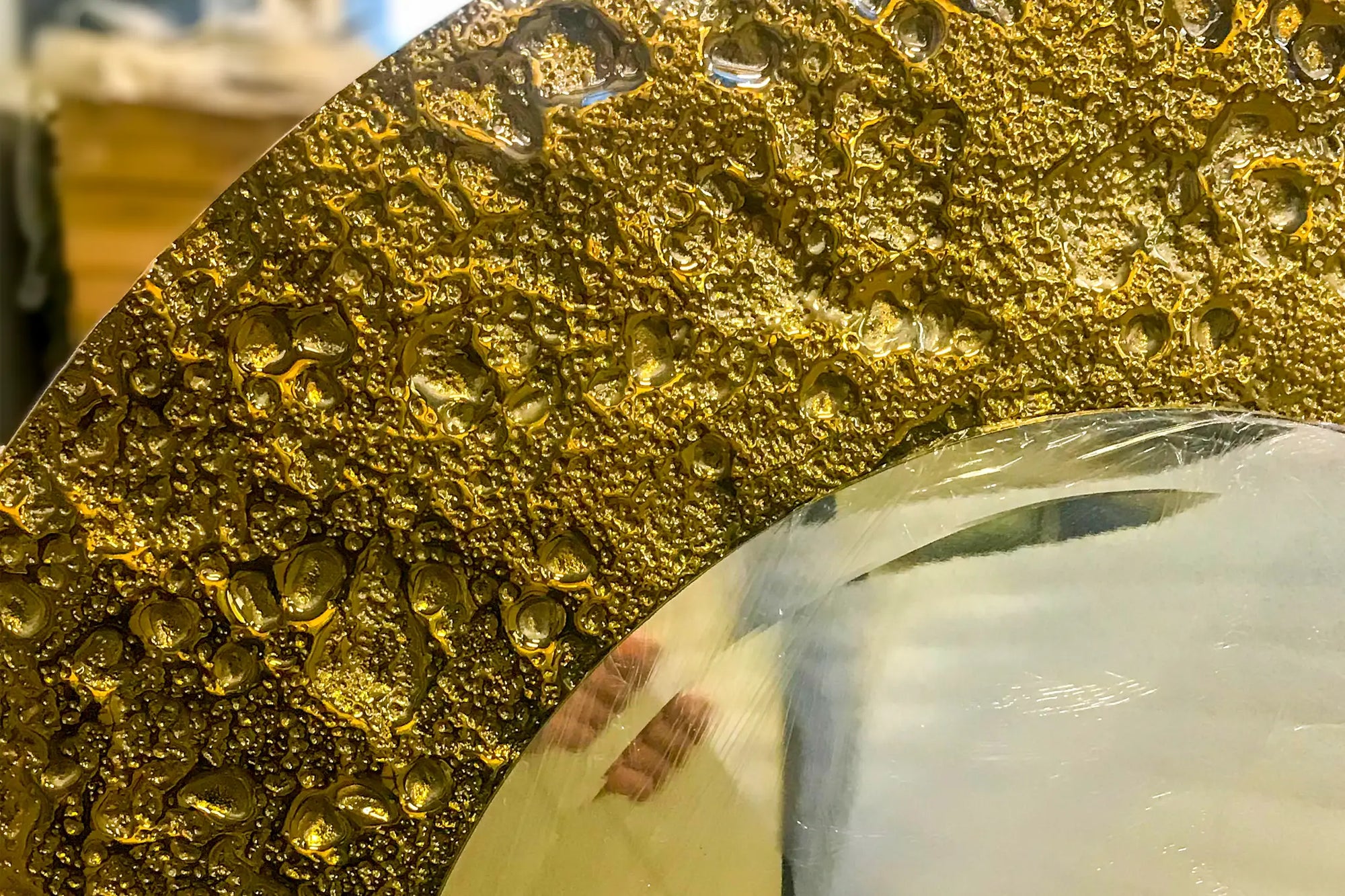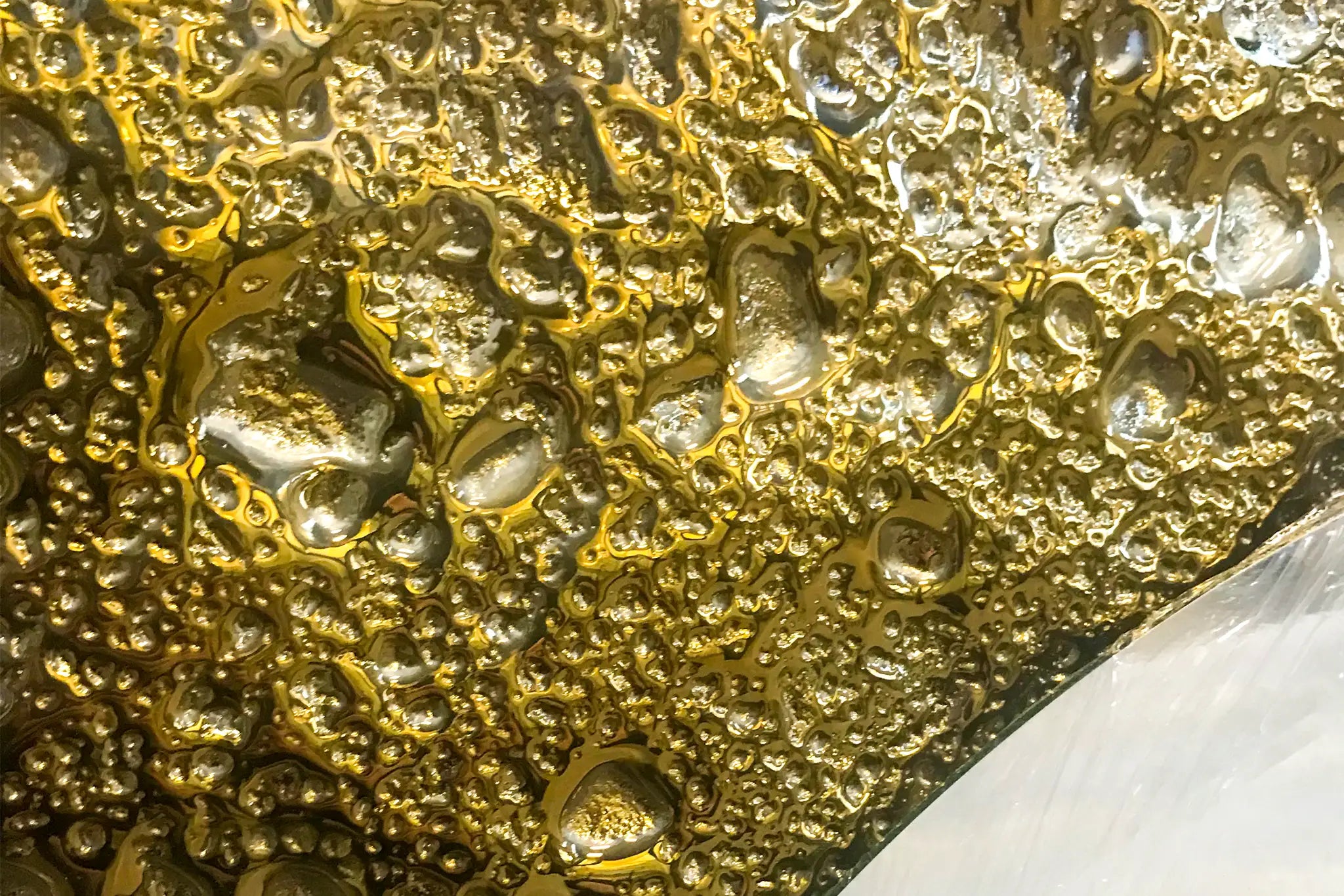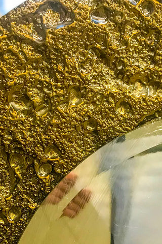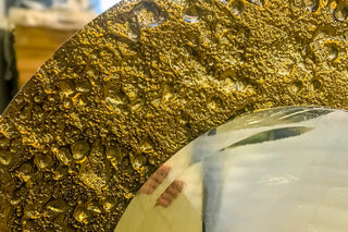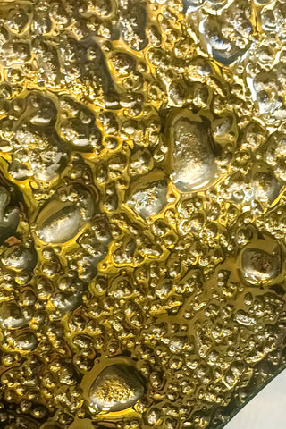 Capture the brilliant glow of a harvest moon with the Luna Gold panel. The three-dimensional, kiln-formed glass recreates the moon’s cratered surface, while a luminous gold finish bathes every ridge and hollow in a warm, opulent light — giving the panel a palpable, celestial radiance.