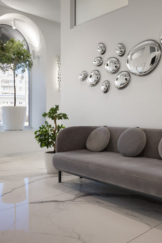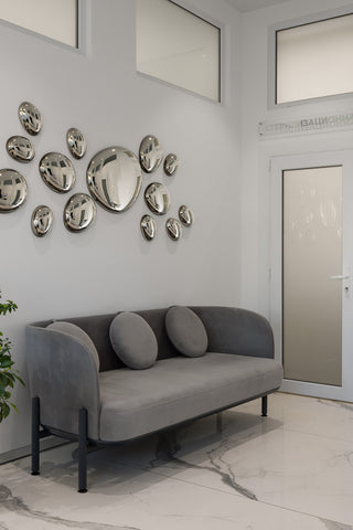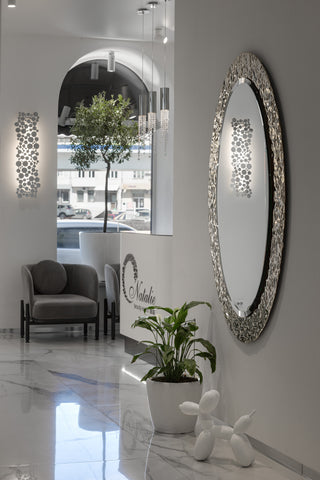 Customer Waiting Area: In the customer waiting area, we placed a 3D Drops Composition, which successfully complements the bright space and makes it more interesting. Additionally, we added an Ellipse Aqua mirror to enhance the waiting area further.