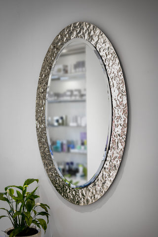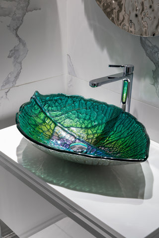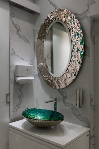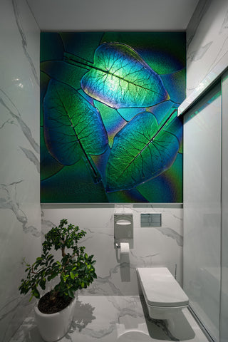 Restroom: Special attention was given to the restroom, where we installed a custom-sized wall panel uniquely designed for this project, measuring 1800 mm by 2140 mm. The panel boasts a beautiful leaf motif, designed to harmonize with the leaf-shaped sink, adding a natural and serene touch to the space. Additionally, our Ellipse Aqua mirror, which mimics the texture of water, enhances the restroom's atmosphere, supporting the center's aim to provide a cohesive and soothing experience.