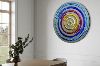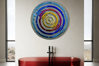 Мурал Alternative Interference Circle — це захоплюючий настінний декор зі скла, що складається з концентричних кіл різних кольорів, створюючи динамічний і яскравий акцент для будь-якого інтер’єру. Скляні елементи майстерно підібрані так, щоб плавно переходити з одного відтінку в інший, а при підсвічуванні композиція оживає грою світла й тіней, стаючи витонченим доповненням сучасного простору.