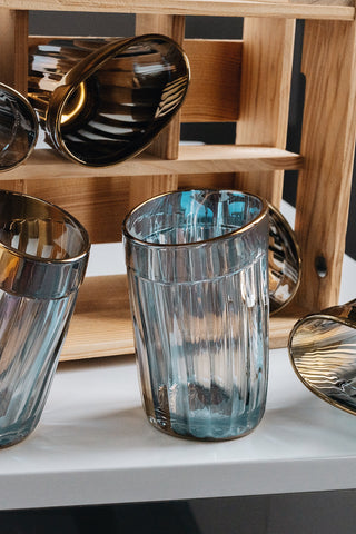 У наборі: 6 склянок у дерев'яній коробці ручної роботи Обʼєм: 200 мл Висота: 15 см Розміри упаковки: 29 × 21 × 14 см Вага: 2,2 кг