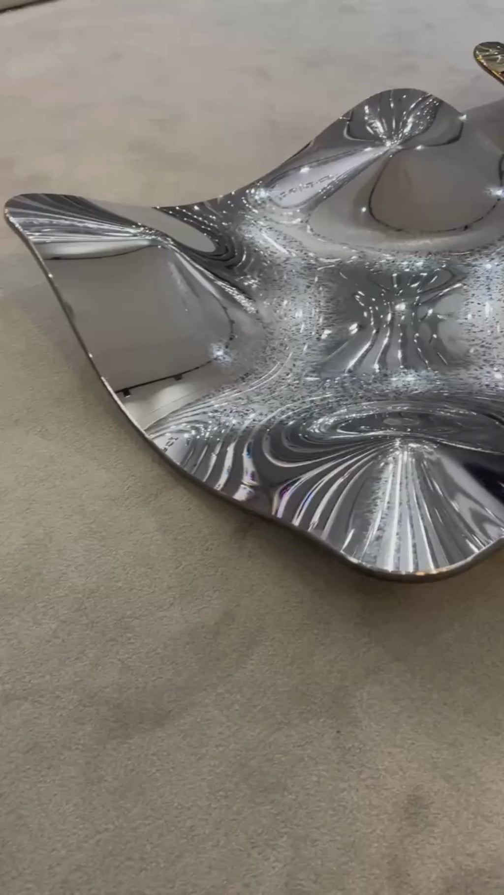 Плато Manta Gold формує розплавлене скло у вигляді розкішних крил, а потім покриває кожен вигин титаново-золотим дзеркалом, що сяє, наче схід сонця на рідкому металі. Два формати — 600 мм (23,6 дюйма) і 700 мм (27,6 дюйма) квадратні — вага 9 кг (19,8 фунта) та 12 кг (26,5 фунта), забезпечують надійну стійкість на обідніх столах чи готельних столиках. Грановані ребра відбивають світло підвісних ламп, створюючи теплі відблиски на лляній, кам'яній чи оксамитовій поверхні. Край товщиною 4 мм (0,2 дюйма) підкреслює майстерність виконання, а глибока центральна чаша ідеально підкреслює тропічні фрукти або арт-об'єкти. Кожен виріб майстри завершують вручну, після чого покривають дзеркальний шар захисним покриттям для легкого догляду, підтверджуючи кредо PlusObject: краса працює через усвідомлену присутність.
